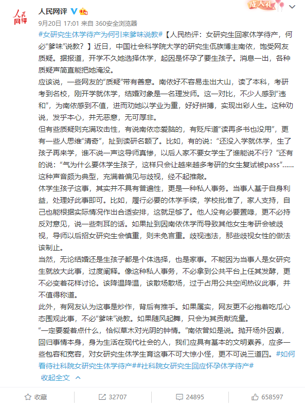 人民网还引述了南依的一句话“一定要爱着点什么,恰似草木对光阴的钟情”,强调身为生活在现代社会的人,我们应具有基本的文明素养,应多一些包容和宽容,对女研究生休学生育这事不可大惊小怪,更不可说三道四。