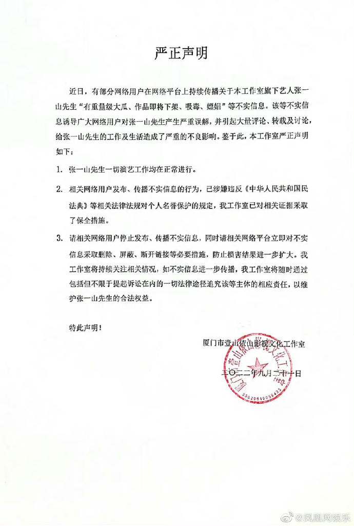 当晚,张一山工作室@壹山逸事 发布声明称,网传张一山“有重量级大瓜、作品即将下架、吸毒、嫖娼”等为不实信息,并表示张一山的一切演艺工作均在正常开展,工作室已对相关证据采取了保全措施,将随时依法维护合法权益。