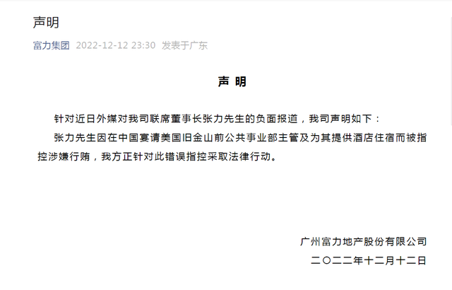 对此,富力集团深夜在官方微信账号发布了一则声明称,针对近日外媒对联席董事长张力先生的负面报道,我司声明如下:张力因在中国宴请美国旧金山前公共事业部主管及为其提供酒店住宿而被指控涉嫌行贿,我方正针对此错误指控采取法律行动。