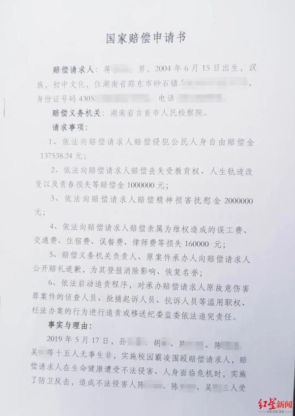 蒋佑华告诉红星新闻记者,小蒋本人不愿再来到吉首这个“伤心之地”,因此由祖父及代理律师代为提交国家赔偿申请书。在申请书中,小蒋向吉首市人民检察院提出了近330万元的索赔诉求,其中包括侵犯人身自由赔偿金13.7万余元、丧失受教育权及青春损失100万元、精神损害抚慰金200万元等。