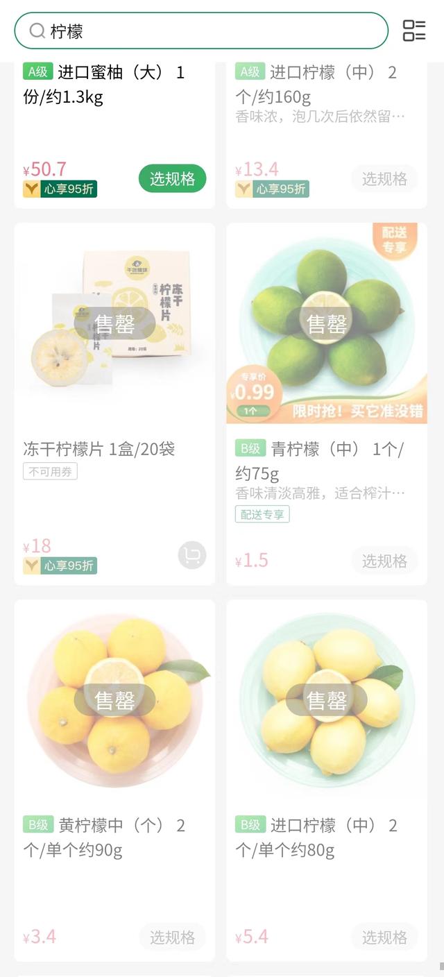 百果园小程序中上海部分地区柠檬售罄在叮咚买菜平台,上海市静安区范围内多个柠檬品种均显示补货中,柠檬片、柠檬百香果茶,甚至柠檬味糖果、柠檬味气泡水,均已显示售罄。盒马平台部分地区的2颗装柠檬约120克,售价3.9元,目前正在补货中;整箱装的柠檬8颗售价约33.9元,由商家发货、第三方平台配送,目前仍支持下单。