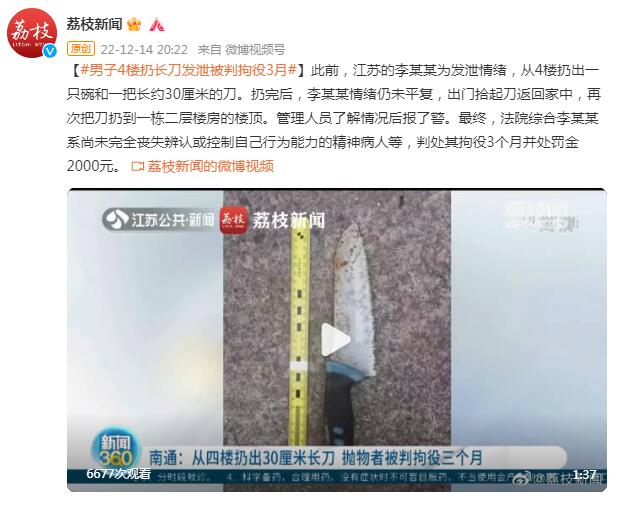 此前,江苏的李某某为发泄情绪,从4楼扔出一只碗和一把长约30厘米的刀。扔完后,李某某情绪仍未平复,出门拾起刀返回家中,再次把刀扔到一栋二层楼房的楼顶。管理人员了解情况后报了警。最终,法院综合李某某系尚未完全丧失辨认或控制自己行为能力的精神病人等,判处其拘役3个月并处罚金2000元。