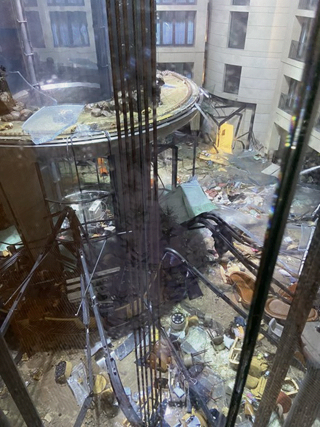 网友发布在推特上的图片:世界最大独立圆柱体水族馆爆裂后现场的残骸