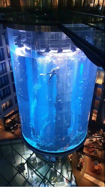 网友发布在推特上的视频截图:世界最大独立圆柱体水族馆原状