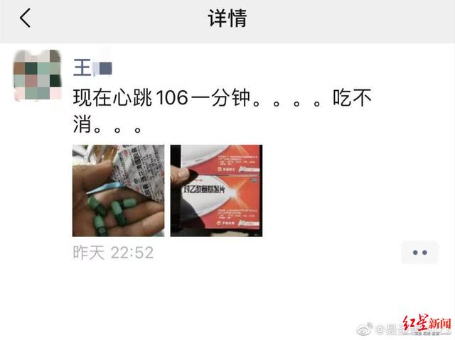 红星新闻记者注意到,在聂圣哲12月22日发的讣告配图中,有一张王某朋友圈截图。截图里确系有其手握连花清瘟胶囊的图片,此外,还有一张手拿对乙酰氨基酚片的图片。截图配文称,“现在心跳106一分钟,吃不消”。