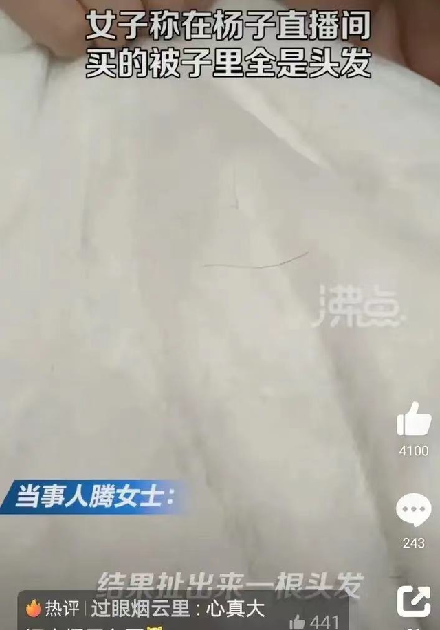 浙江舟山,一名女性消费者腾女士杨子的直播间购买了一床2米*2.3米的被子,售价为399元。这几天刚拿出来给儿子盖。孩子盖了几天总觉得身上刺挠,剪开发现被子里面全是头发。