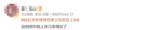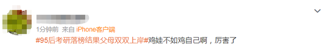 近日,95后女生陈女士哭笑不得地晒出父母考研成功,自己落榜的经历。陈女士称,自己去年开始备战考研。父母为了增添她的信心,与她一起备考。不料成绩出来后,父母考上了,她本人落榜了。陈女士的父母都毕业于重庆大学,是重庆的985。对于她没“上岸”这件事,父母劝她“看开点”。
