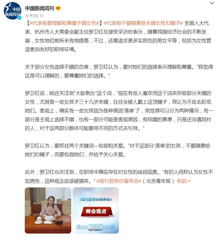 罗卫红说,她还关注到“大龄剩女”这个词,“现在有些人喜欢用这个词来形容部分未婚的女性,尤其是一些女孩子三十几岁未婚,往往会被人戴上这顶帽子,我认为不应去贬低她们。客观上,确实有一些女孩因为各种原因‘落单’了,我觉得可以分为两种情况,有一部分是主观上选择不婚,也有一部分可能是客观原因,有结婚的意愿,只是还没遇到对的人,对于这两部分群体可能要用不同的方式去引导。”