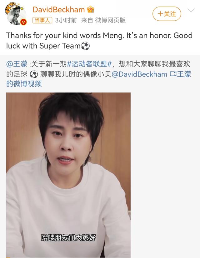 新一期“运动者联盟”更新后,原短道速滑运动员王濛今天更新微博,和网友们分享了她和足球的故事,并在线表白了自己喜欢20多年的偶像英国著名足球运动员贝克汉姆,随后贝克汉姆微博回复了王濛,真是体育界的梦幻联动啊。