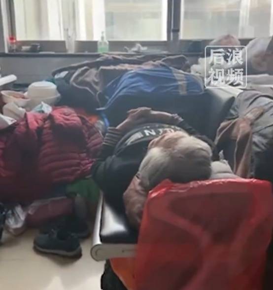 视频中,两老人躺在医院彩超室的椅子上,就诊的病人只能往前坐,他们身边还堆满各种生活用品。
