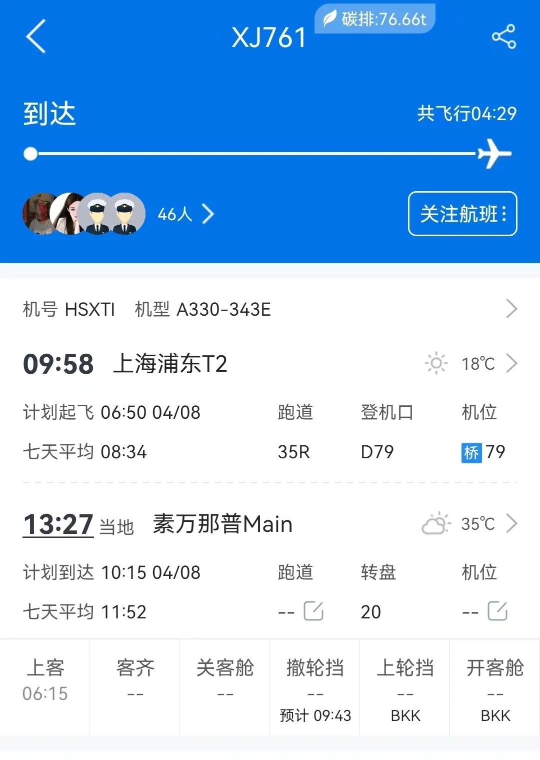 据悉,该航班为泰国亚航X的XJ761航班,由上海浦东飞往曼谷。飞常准数据显示,该航班原计划早上06:50起飞,实际09:58起飞,延误3个小时。
