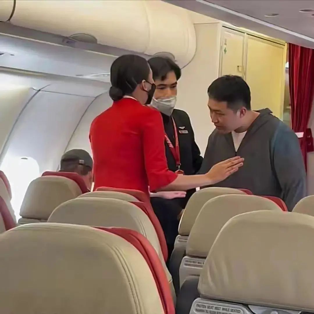 一名空姐和一名空少出来拦住这名男子,不断进行劝说。两名外国旅客始终没有发声。