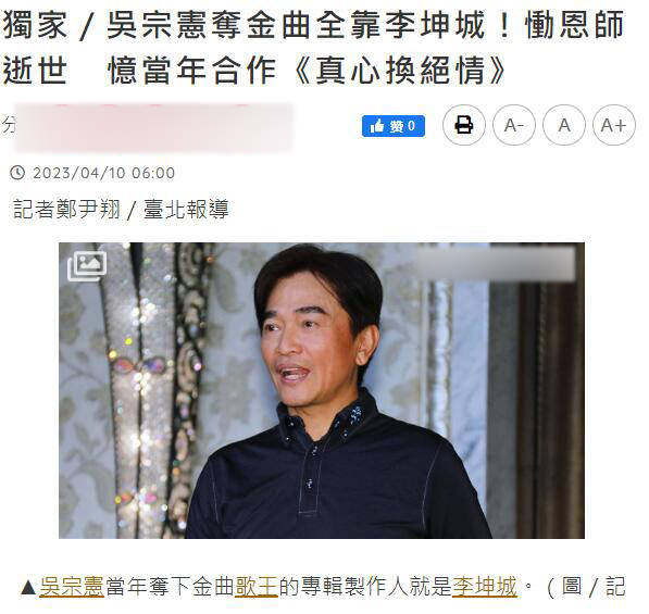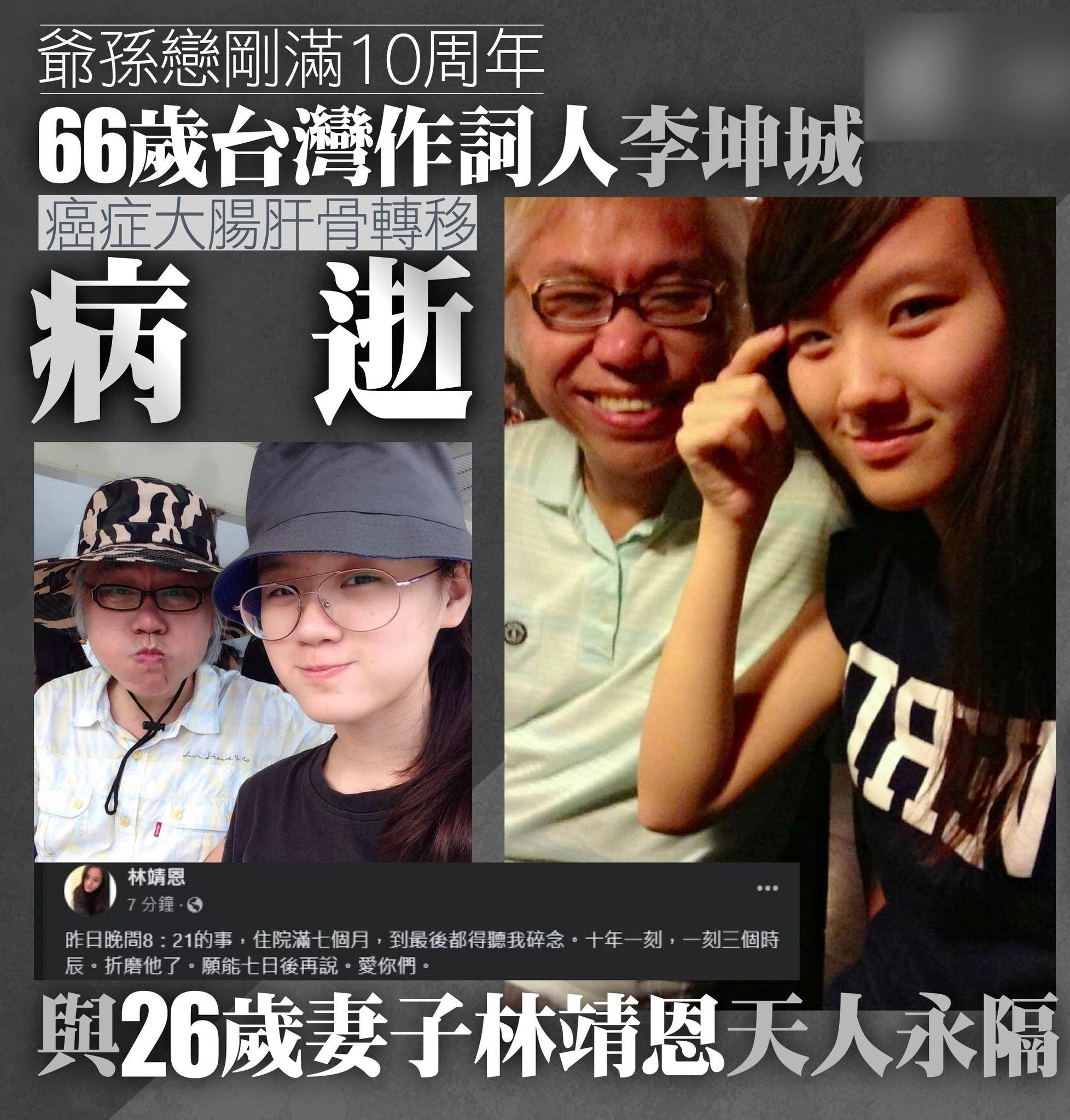 台湾音乐人李坤城于4月8日因癌症去世,终年66岁,死讯由其子公开,小40岁遗孀林靖恩不久后证实,并透露二人已经低调结婚。