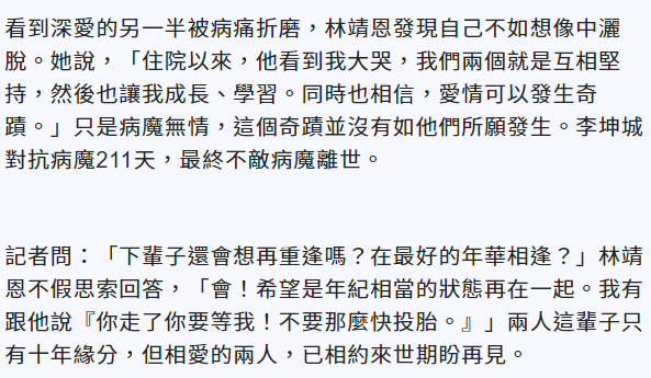 林靖恩与李坤城天天见面,身心憔悴长期失眠,称李坤城一直教导她,好像要让她准备好如何应付。她认为生离死别是早晚的事,没想到会那么开,觉得对不起丈夫,不忍心看着他受苦,经历无数次化疗。